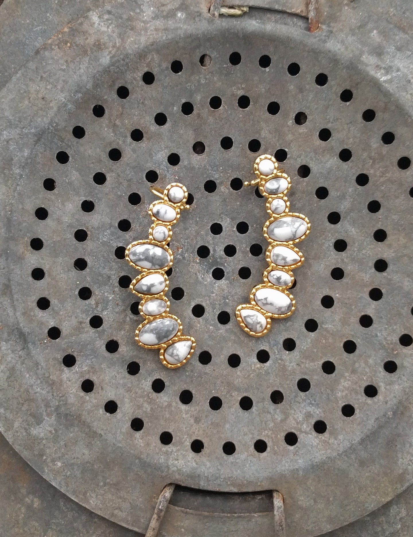 Now you only need one earring to adorn your ear! These white howlite stone ear-climbers are sure to start a conversation with any attire!